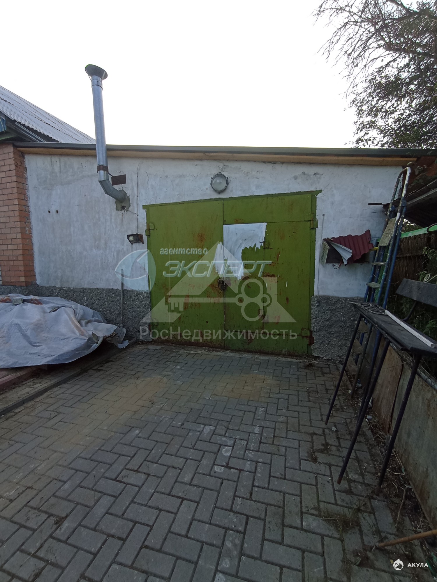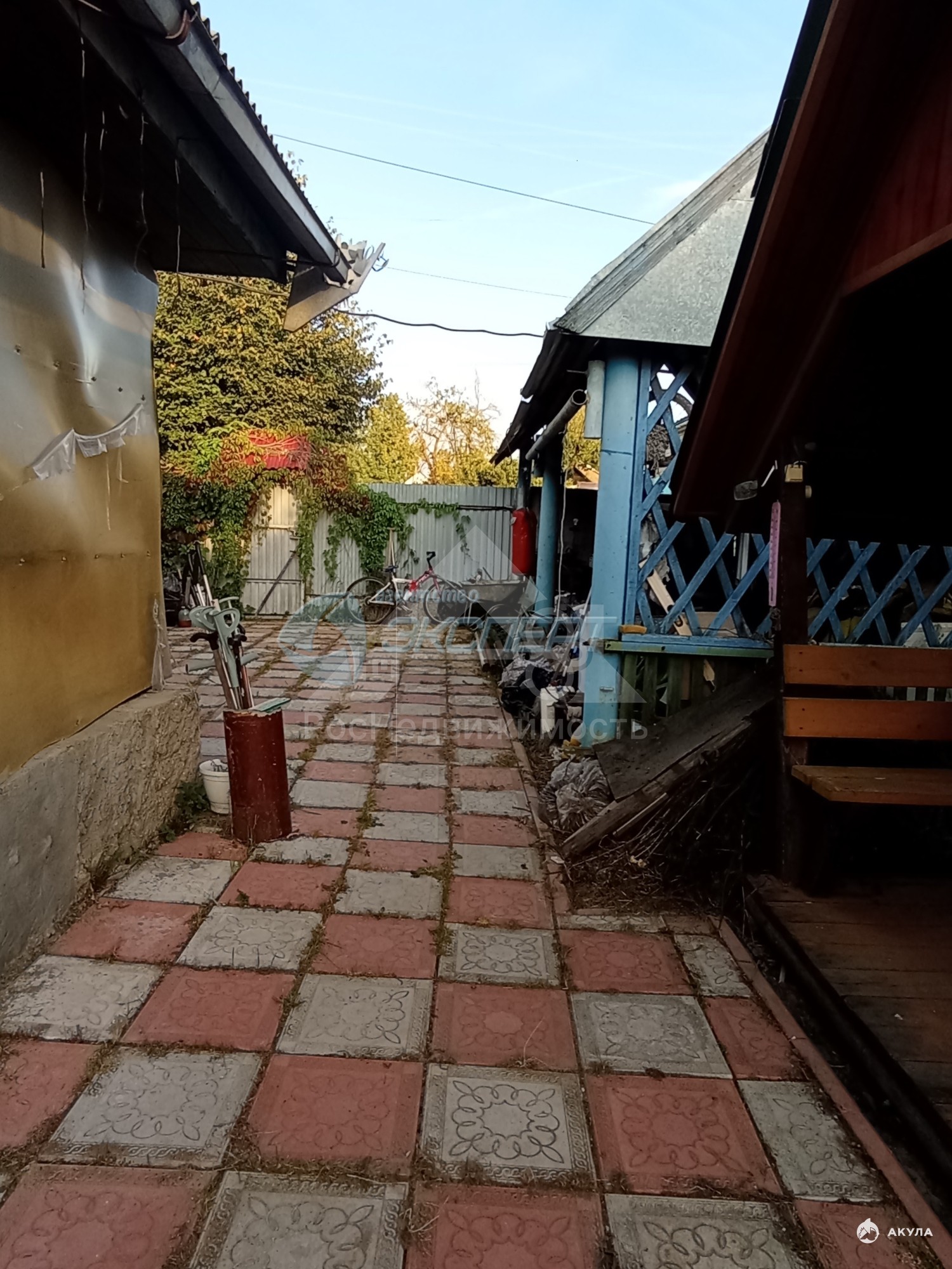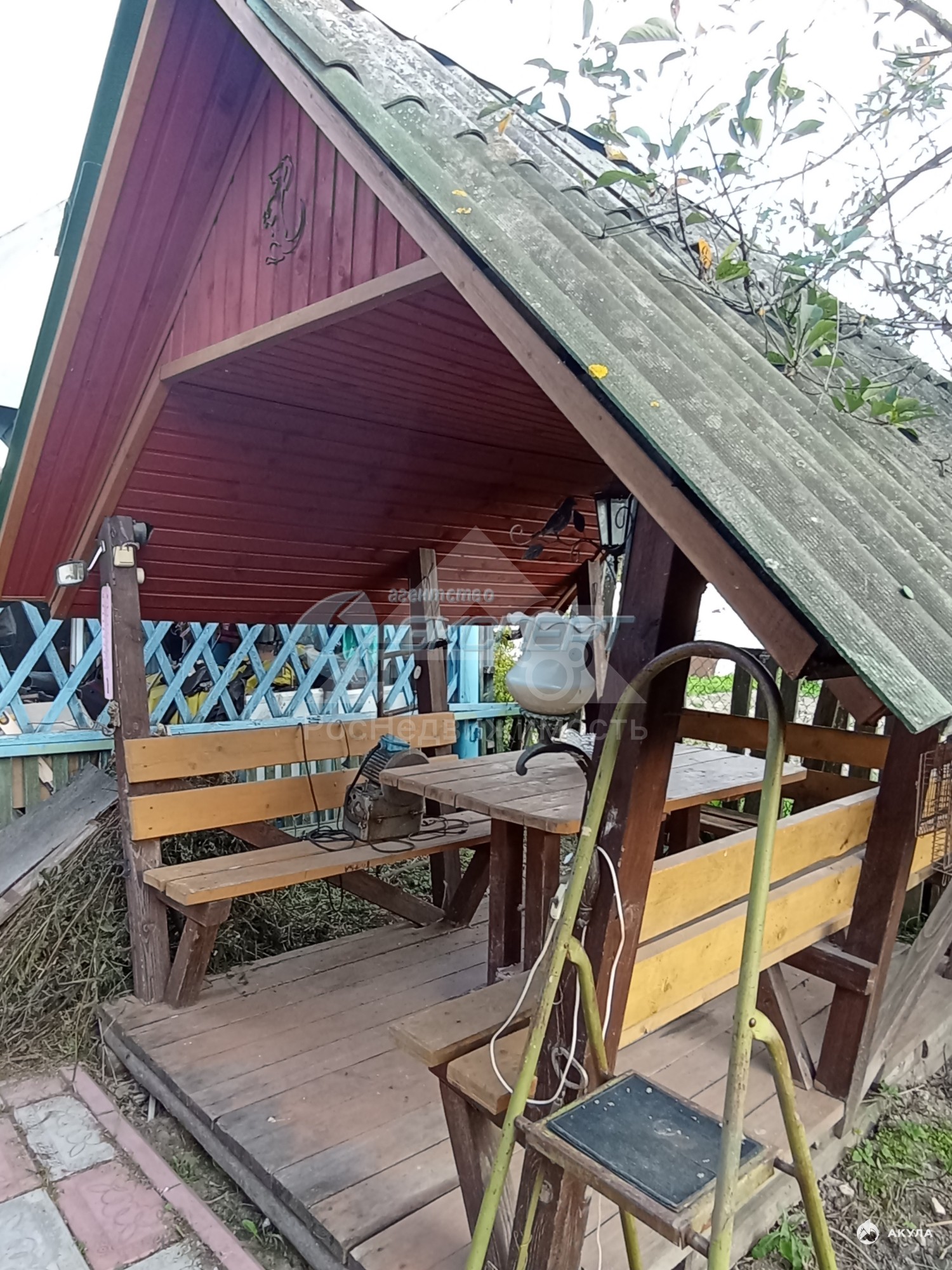 На участке есть гараж - керамзитобетонный, баня с террасой, навес без обшивки с ямой, беседка, теплица. Забор по фасаду - металлопрофиль.