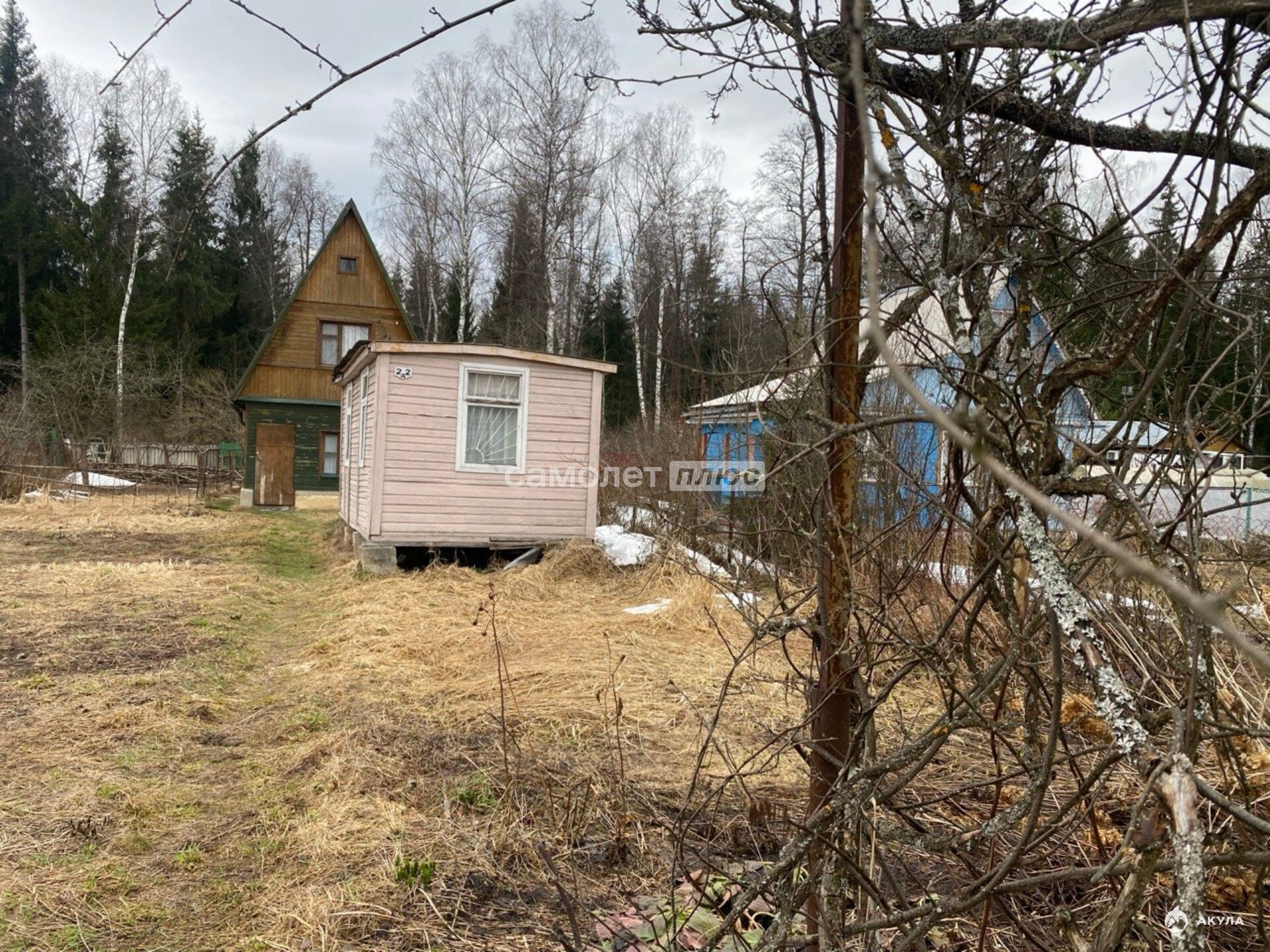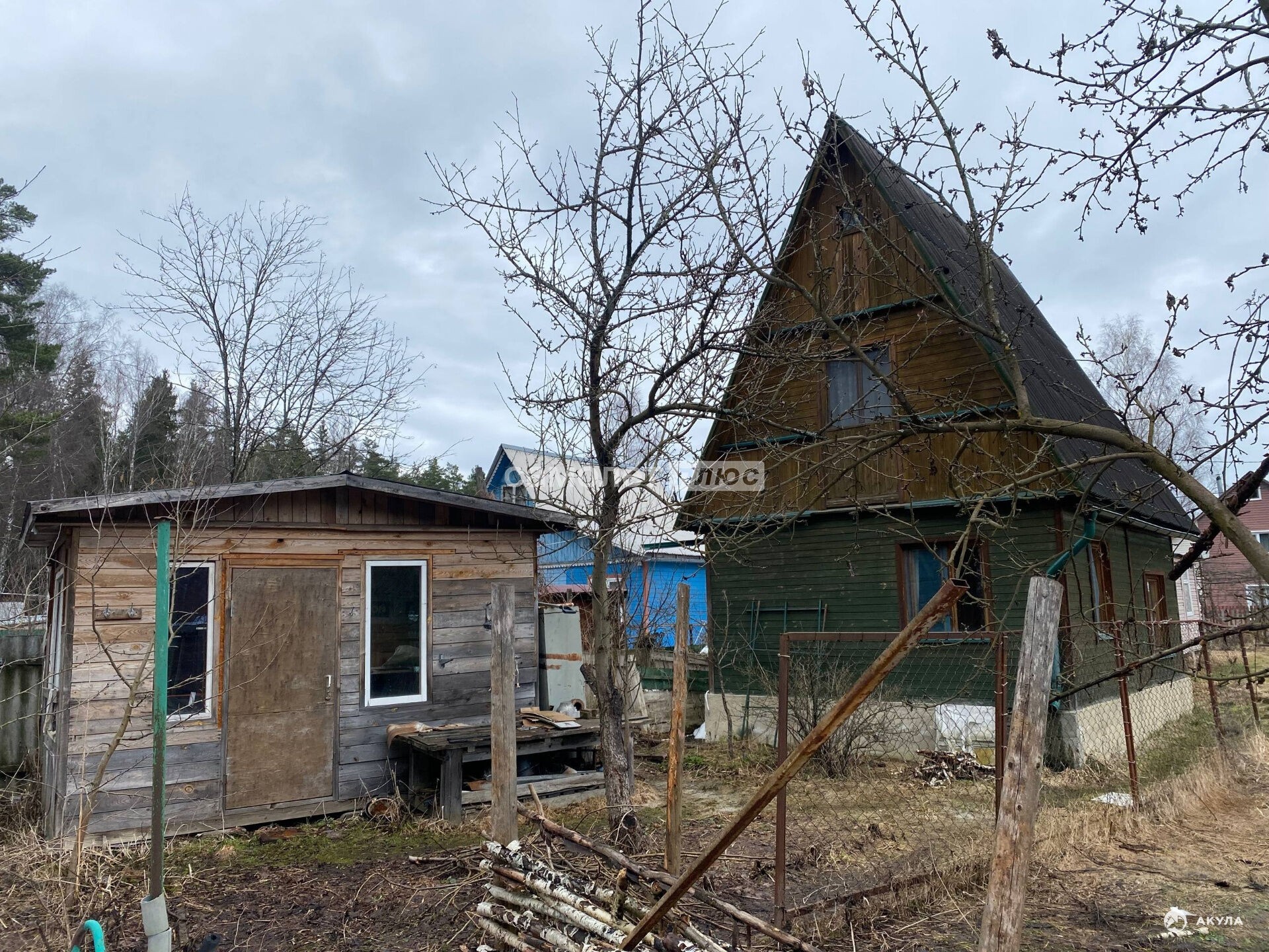 На участке баня-дом 2 этажа + мансарда, отделка вагонкой. Есть гостевой домик, вода заведена.